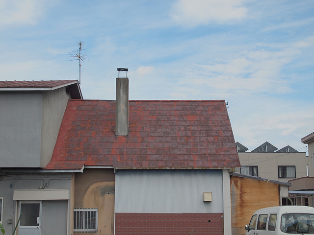入山/大雪が降った年に、雪に押されて集合煙突が屋根の上で30度ほど傾いた例があります。鉄筋で補強したブロックの煙突でも、かなり傷んでいる場合が多いですね。