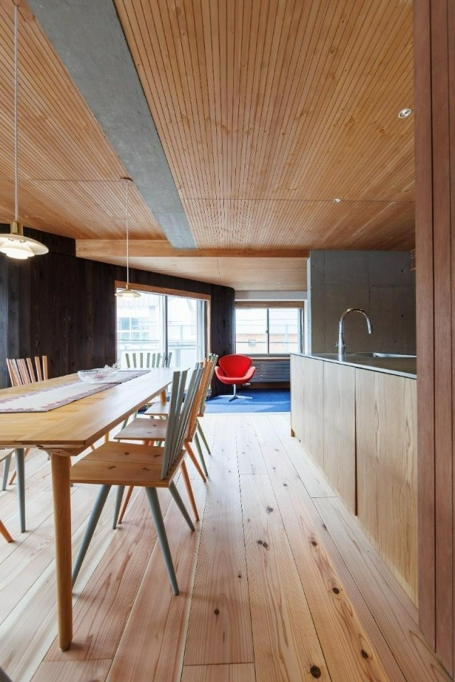ダイニングの床材には吉野杉無垢フローリングを採用。天井には溝加工し、柿渋で仕上げた道産のトドマツ合板を使っています。