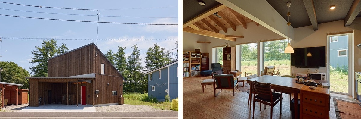 外壁は経年で節が抜けにくいとされるカラマツの総板張り(写真左)。広々とした21.6帖のLDK(写真右)。カラマツの柱とナラの床、ホタテの貝殻を使った塗り壁といった自然素材にこだわっていることが特徴的です。以前から使っているちゃぶ台や家具がナチュラルな住空間になじんで、新築とは思えない落ち着きを感じさせます。