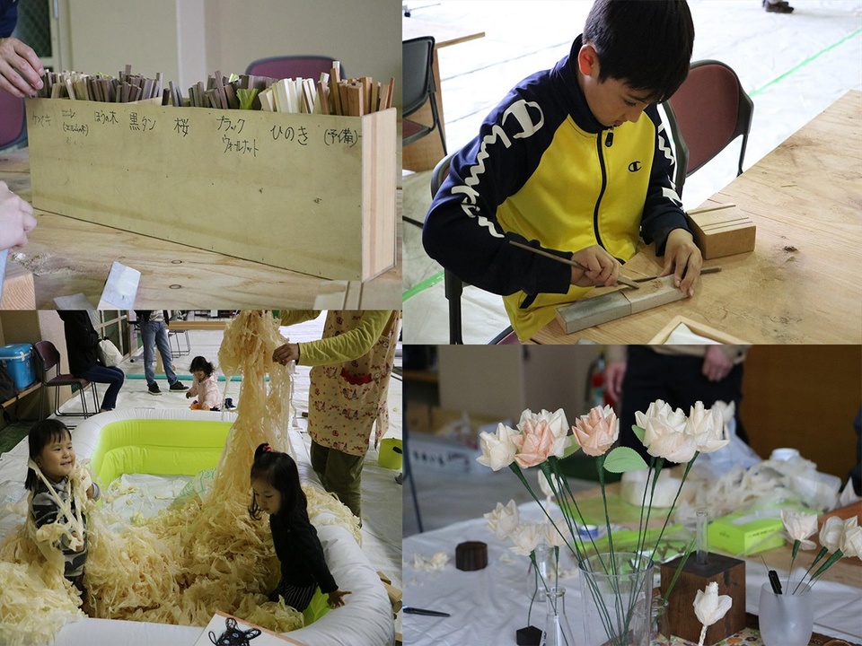 会場には大工職人だけでなく、銘木を使った箸づくり、削りくずを使った削り花づくり、幼児用向けの削りくずプールと、一般市民や子どもを対象にした無料体験コーナーが設置されていて、参加者は楽しそうに作業に取り組んでいました。