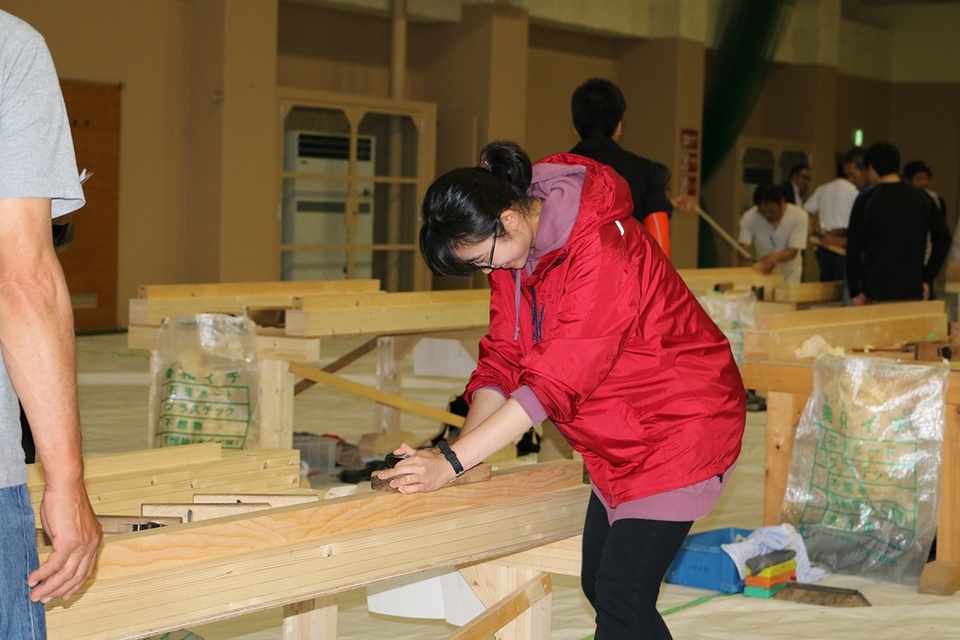 一般の方が参加できるちびっこ大工のコーナーには北海道職業能力開発大学の女子学生の姿が。「授業の一環でやったことはありましたが、鉋を引くのに力が要るし、難しいです」と言いながらも、作業を楽しんでいる様子です。