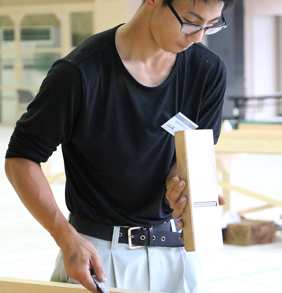 こちらは須藤建設(伊達市・札幌市)の若手大工、山本純也さん(22歳)。「削ろう会」についてお話をうかがうと、「他社の大工さんにも技術を教わることが出来る貴重な機会。鉋という道具一つをとっても奥が深いということを実感しています。こうしたイベントを通じて、一般の人や子どもにも大工の世界を知って、興味を持ってもらいたい」と話してくれました。