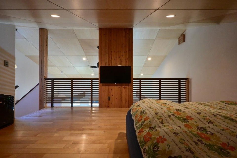 吹抜けを介して1階の様子も感じられる2階の寝室