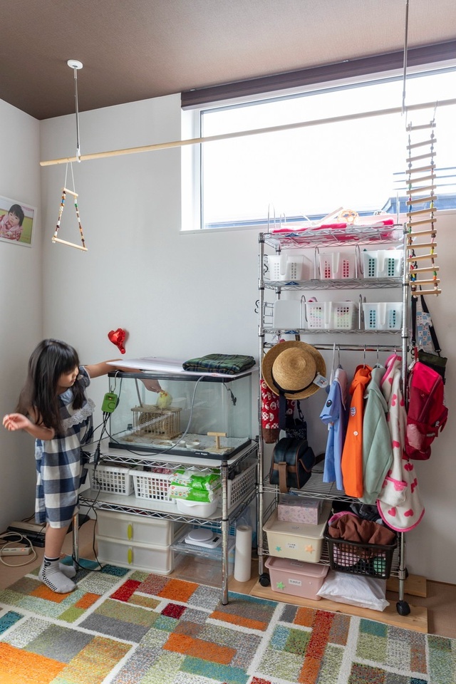 家を訪ねた取材スタッフに、元気いっぱいの娘さんは真っ先にオカメインコの「おもち」ちゃんを紹介してくれました。ファースの家は、室内の空気環境に敏感な鳥の飼育にも適しています。