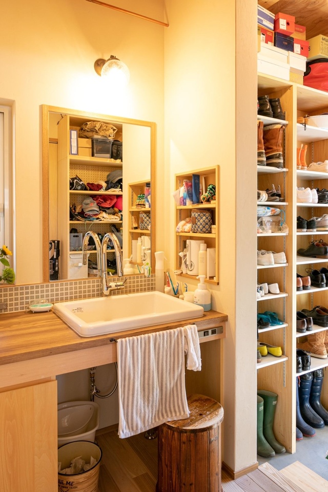 キッチンの向かい側にある、家型フォルムの間口の奥は洗面所になっています。造作の洗面台は収納たっぷり。踏み台もラックの下にすっきり収納できます。