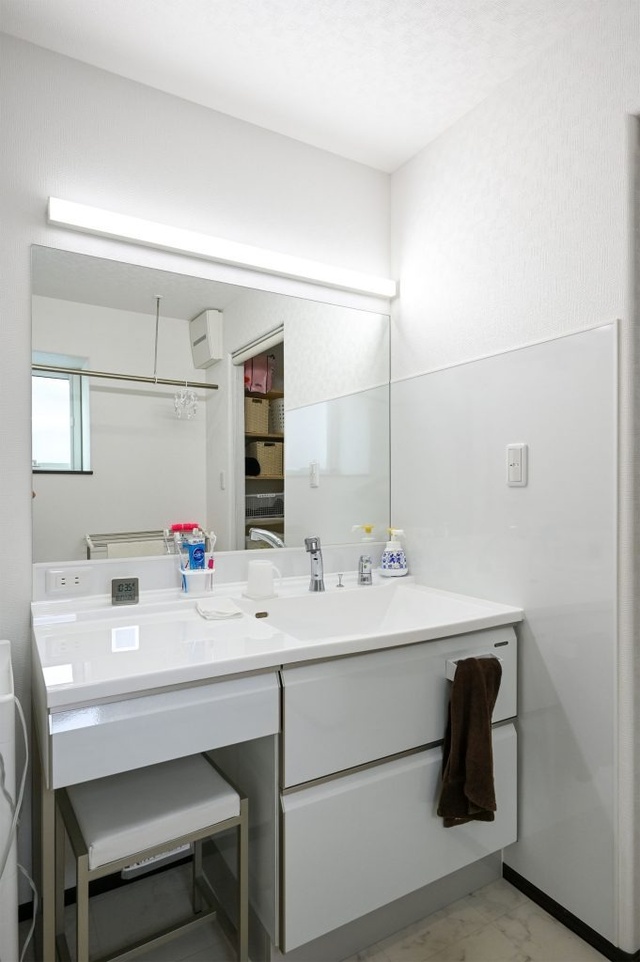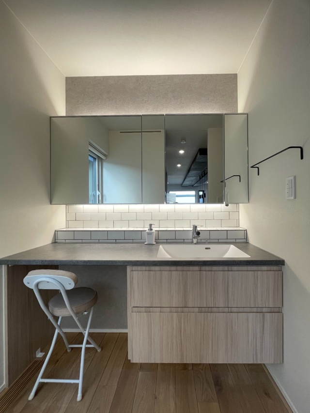 洗面台は I さんの要望で洗い物がしやすい深めのシンクを採用。アイロンやメイク時に座れるようにプランしています。