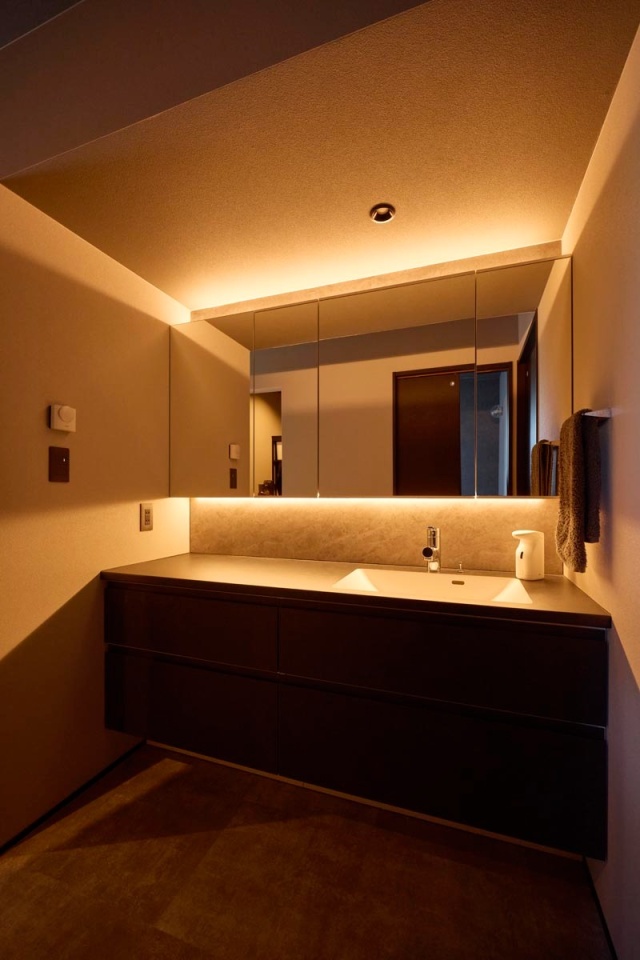 奥さま 私が一番こだわったのは洗面室で、2人同時に使える広さになっています。ホテルで一目ぼれした洗面室をイメージしてお願いしたもので、三面鏡付きで、奥行きを持たせたデザインに、間接照明やタイルをあしらい造作してもらっています。気分が上がる、お気に入りの空間です。