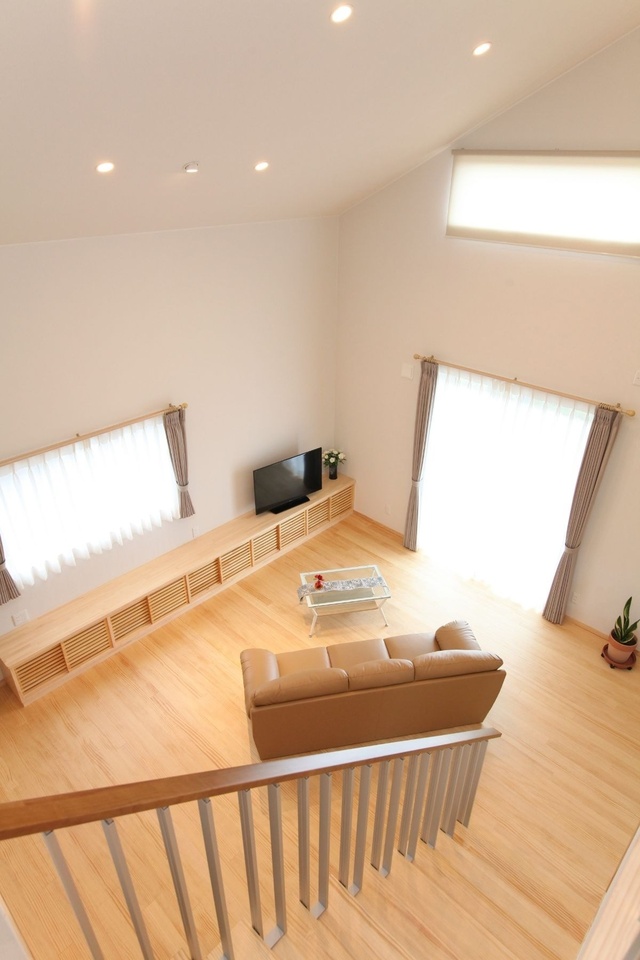 ファミリー向けのプランで、1階はLDKと和室、水回りが中心で24.94坪。大きな吹き抜けもあり開放感抜群です。