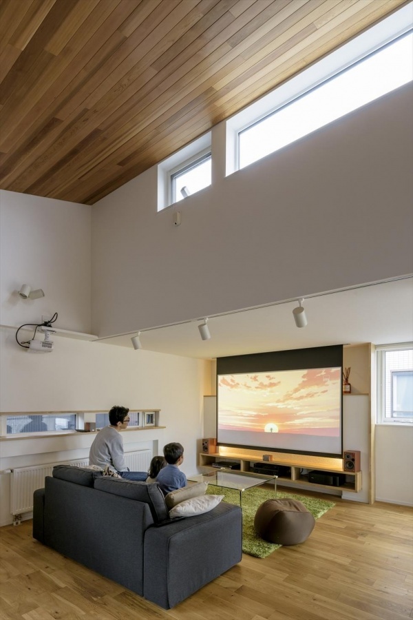 テレビコーナーのアクセントボードはソファの色味に合わせたダーク・カラー。前面に厚みが出ているのは内部に配線類を収めているためで、外壁と内壁の間に入っている断熱材に影響が出ないよう配慮されたデザインになっています。棚の上にはプロジェクターが設置されていて、ホームシアターの配線は、吹き抜けの梁の中と、床下にも収まっています。