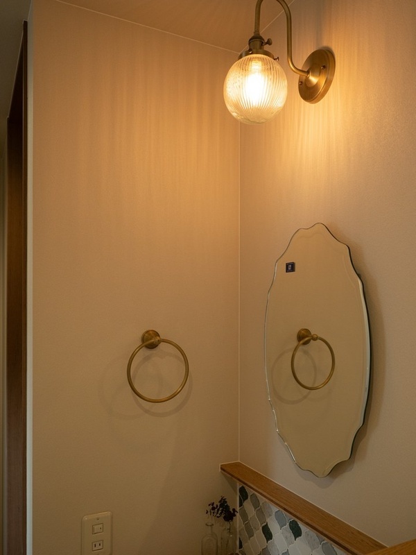 2階の洗面化粧台は、名古屋モザイクや真鍮の蛇口、アンティーク調のランプなど、室内インテリアにもマッチしており、特に気に入っています。
