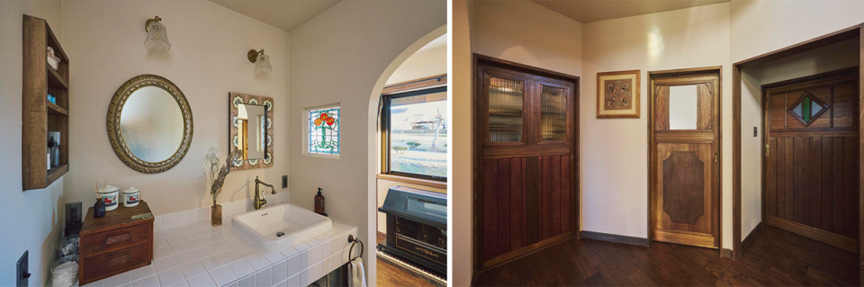 室内ドアは、アンティークショップで見つけた大正時代のものや手作り家具の工房にデザインをオーダーした一点もの。古いドア特有の背の低さも趣があります。