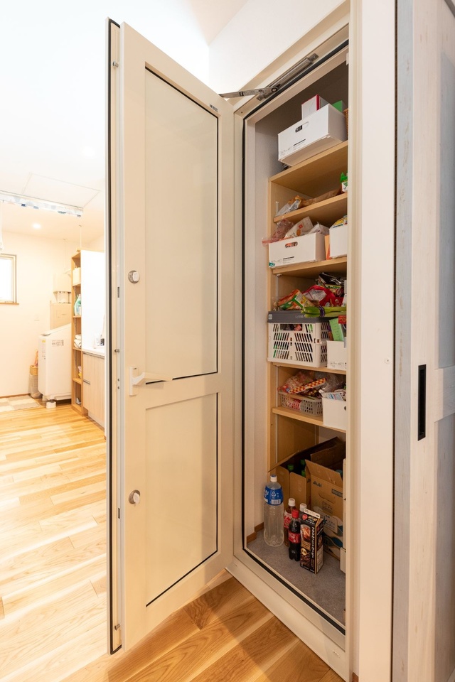 さらに、「収納を多めに」という奥様の希望から大きめの食品庫を2ヵ所に設置。キッチンとユーティリティの間にある食品庫(右)は保冷タイプで、内部の換気扇を回すと冬には外の冷気が導入され、野菜や飲み物を保存するのにちょうど良い温度になります。