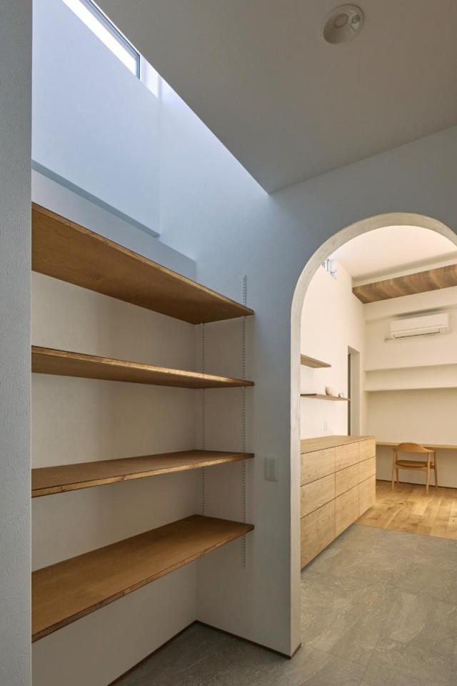帯広市の工務店YOTUMOKU-side(ヨツモクサイド)が手掛けた、こちらの平屋住宅のパントリーには、上部に高窓があります。窓の向かいにある壁がレフ板のような役割を果たし、暗くなりがちな家の中心部でも、照明に頼らず過ごせます。造作棚にすっきりと収納できます。