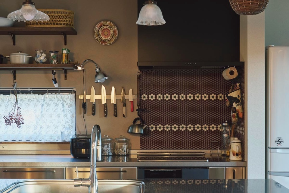 カントリーヴィレッジの家づくりの大きな特徴に、一緒にインテリアをデザインするコーディネーターの八木睦美さんの存在があります。写真のレンジフード下のタイル部分もKさんがイメージする写真を元に打ち合わせを重ね、色や配置バランスを考え抜いたもの。タイル屋さんがモザイクタイルを一枚一枚丁寧に施工しました。照明や雑貨が醸し出す雰囲気をまとめる、インテリアの主役になっています。