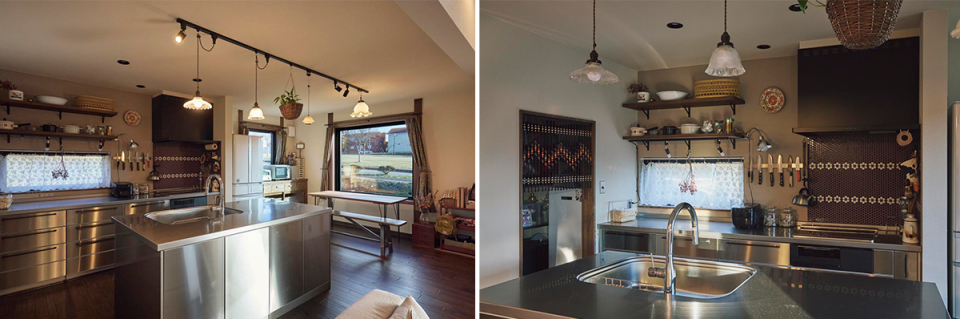 キッチンは、天板を厨房機器メーカーで、フレームを鉄工所で特注。溶接の跡を残し、塗装せず素材感を出しています。