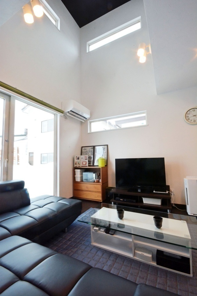 北斗市Tさんのお宅。リビングは2階の天井までの高さがある吹き抜け空間です。解放感も魅力ですが、子ども部屋とリビングとの間で、親子のコミュニケーションがしやすいのも吹き抜けのメリットです。T邸は、きわめて高性能な高断熱高気密住宅なので、そもそも室内の暖かい空気が屋外にほとんど逃げません。少ない暖房エネルギーで家じゅうを暖かく維持でき、床下に1台設置した6畳用エアコンから家じゅうに暖気を送る方式なので室内に暖房機を設置する必要すらありません。