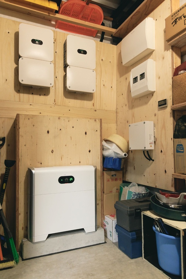 晴れた日なら午前10時には満タンになっているという5キロの蓄電池。現在は余った電力を売電していますが、いずれは蓄電池を増設して100%の電力を賄えるようにと計画しています。