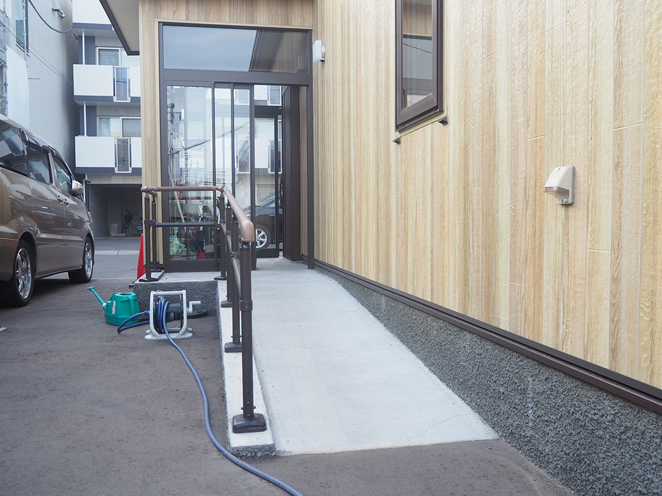 JR駅や幹線道路に近い住宅地に立つH邸は、60代の奥さまと70代のご主人が暮らす新居です。設計・施工したのは白石区の瀧本ホーム。ご夫婦が新築したのは、老後の「車イスの生活」を想定したバリアフリー住宅です。風除室の付いた玄関は、正面階段の付いた道路側と駐車スペースからアクセスしやすいスロープ専用の2か所を設けています。