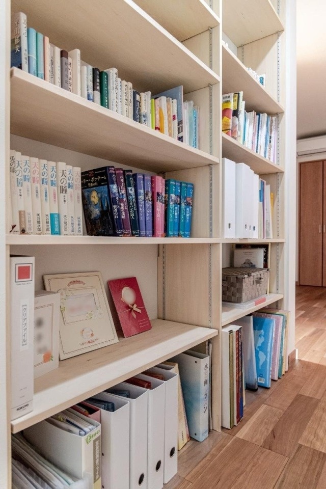 LDKと廊下の間にはリビング側がオープン収納、廊下側が本棚になった間仕切りを配置。その両側を通り抜け、2方向から玄関・水回り・個室へアクセスできます。