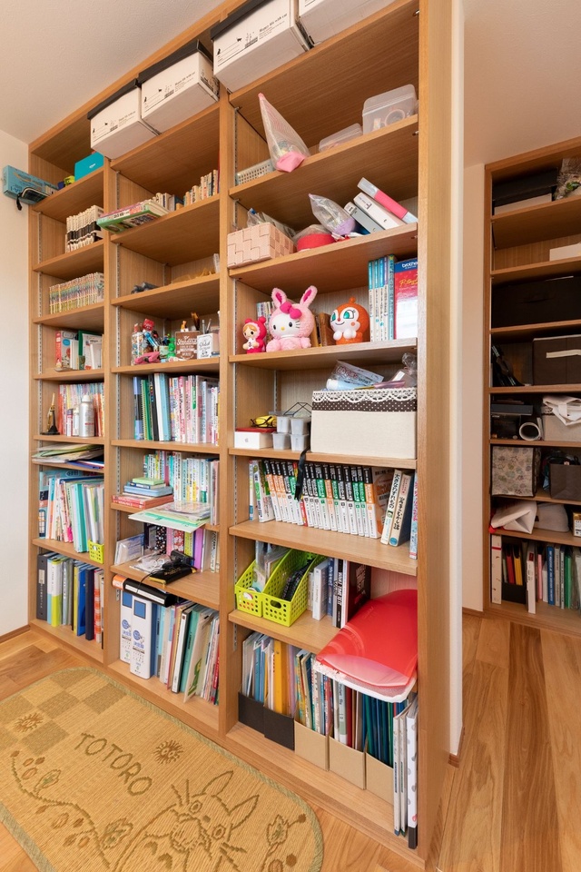 キッチンからも気配が分かる程よい距離感がよく、はしごが付いているので子どもたちも自分で本を出し入れできて、家族で重宝しています。