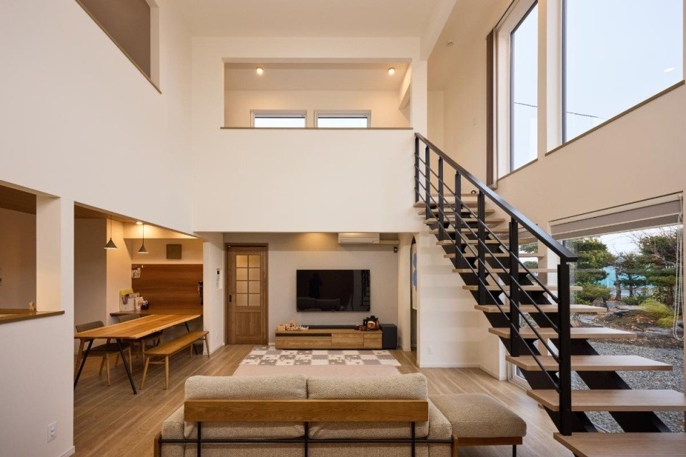 大きな窓から光が降り注ぎ、冬でも晴れた日の日中は暖房要らずだという吹き抜けLDK。気になる夏も「2階のエアコンを1台つけるだけで涼しかった」と、断熱・気密性能のよさを実感している様子です。