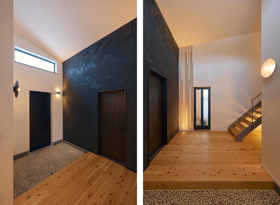 玄関は天井高4m、ホールと合わせると約5.5帖という広さ。洗い出しの土間に白と黒の漆喰壁で洗練された印象です。リビングドア横の木張りのデザインは奥さまの考案。まるでホテルのエントランスのように格調高い空間になっています。