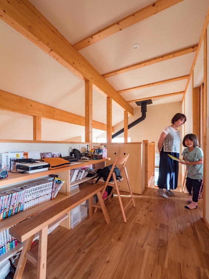 子ども部屋はドアで仕切られず、ワンフロアーにし、見渡せるように、右の本棚で空間をふたつに区切っています。奥様は「子どもが子ども部屋に籠もりきりになったりしないように、家族の様子がお互いに感じられる家にしたいと思ったんです」と話してくれました。