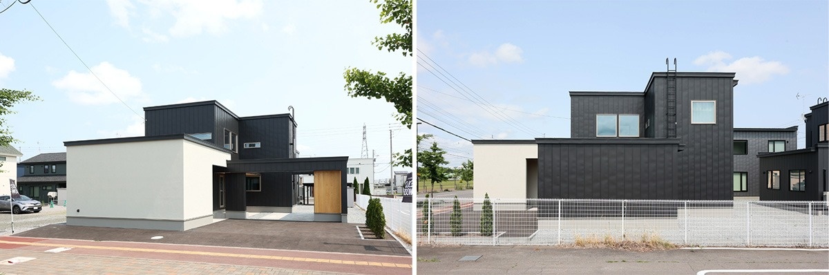 外観はダークカラーのガルバリウムとホワイトの塗り壁でスタイリッシュな佇まい。大きな通りやコンビニエンスストアに隣接することから、プライバシーを確保するための工夫が見られます。