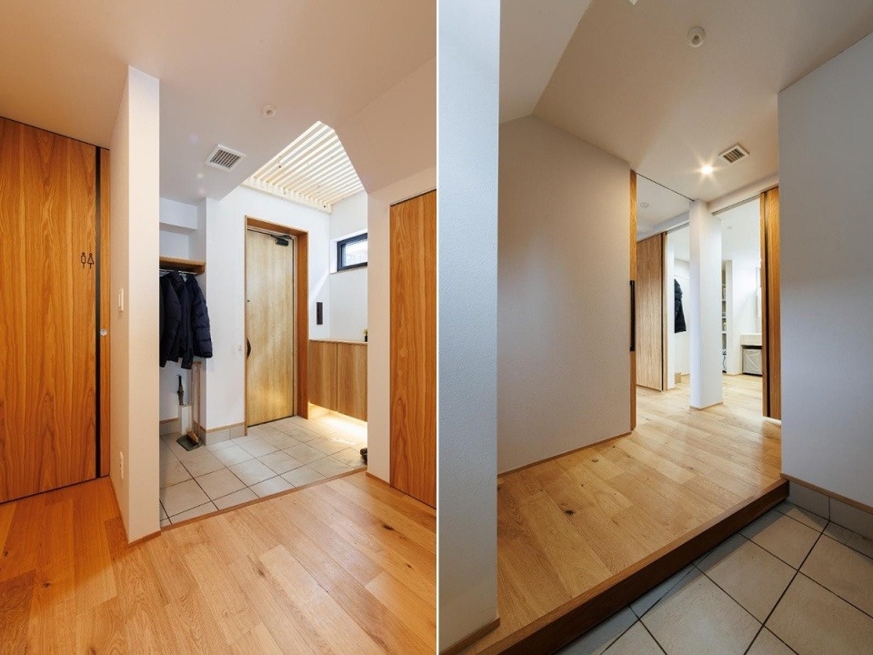 写真右/ホールにはユーティリティーへの出入り口が2つあり、奥の引き戸はダイニングから直線でつながる便利な動線になっています。
