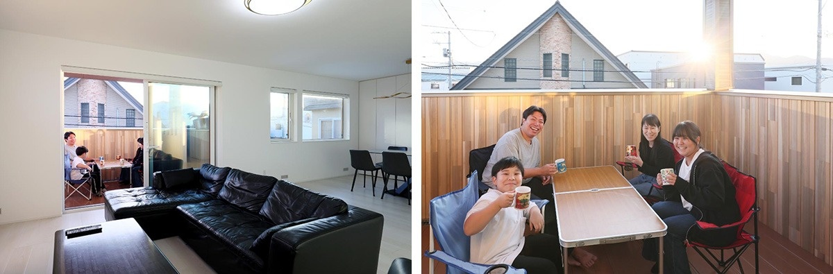 狩野社長 屋上テラスは、夏はプールを出して水遊びや焼き肉をしたり、冬は積もった雪でかまくらや滑り台を作って遊ぶなど、四季を通じてご家族でアウトドアが楽しめるスペースとして提案しています。もちろん青空の下で洗濯物干しもおすすめです。
