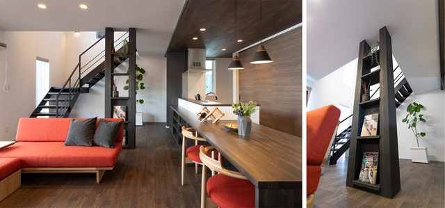 リビングの中央の大黒柱は、もう1本柱を立てて、飾り棚やマガジンラックを造作。ただの柱としてではなく、空間のアクセントとなり実用性も備えた場所となりました。