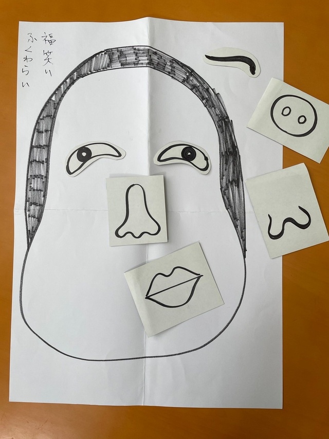 福笑いは大きな画用紙に顔の輪郭を描いたら、目・鼻・口・眉を別の紙で作って出来上がり。ものすごくシンプルですが、目隠しをして、変顔ができると、子どもたちは転げまわって盛り上がっていました。これは就学前のお子さんにもおすすめです。