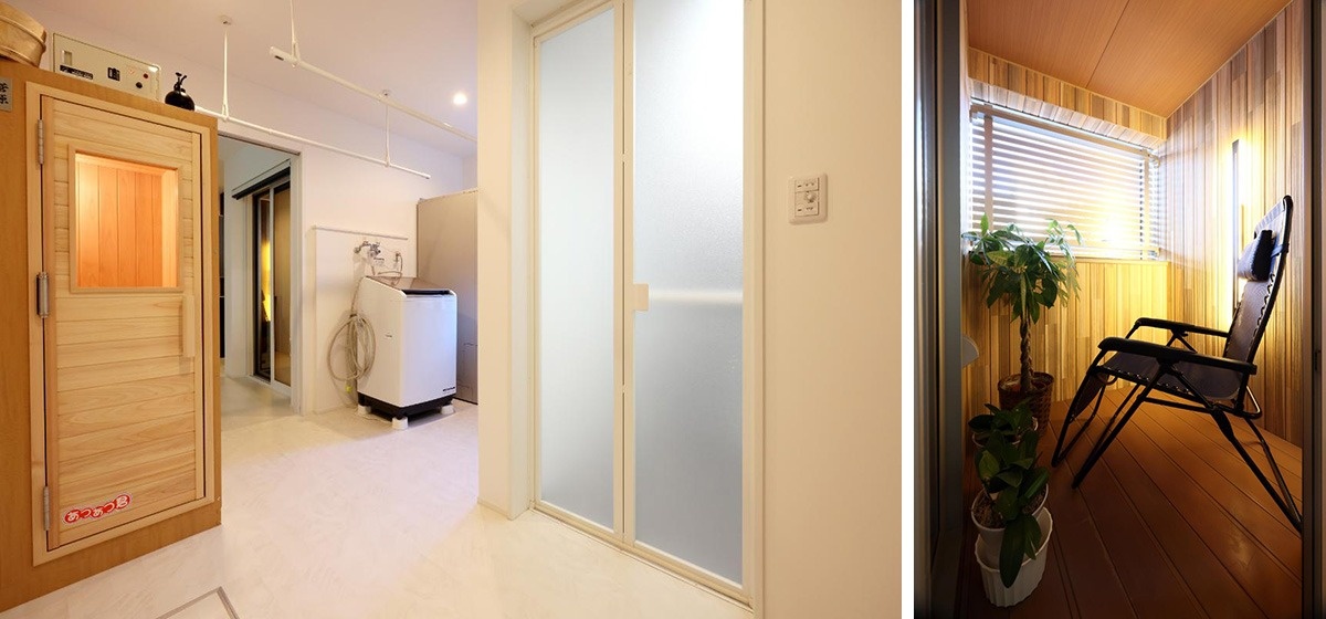 写真左:ユーティリティーの右手にバスルーム、左手にサウナ。奥には外気浴スペースも/写真右:ルーバーで目隠しした外気浴スペース