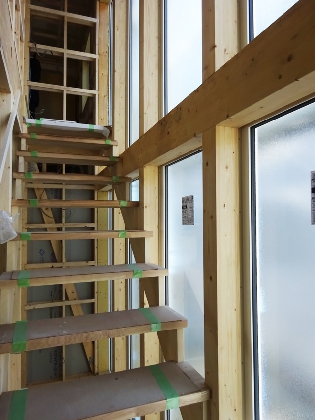入山さん 連続窓は往来からの視線を遮り、光を拡散しながら採り込む不透明タイプ。1階から3階まで続く階段室の美しさがこの家の特徴の一つですが、納め方の細かい部分まで配慮しました。