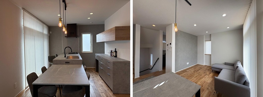 階段を上がると、右手にダイニングキッチン、左手にリビングが広がっています。大きなデザイン窓を配した明るい空間です。