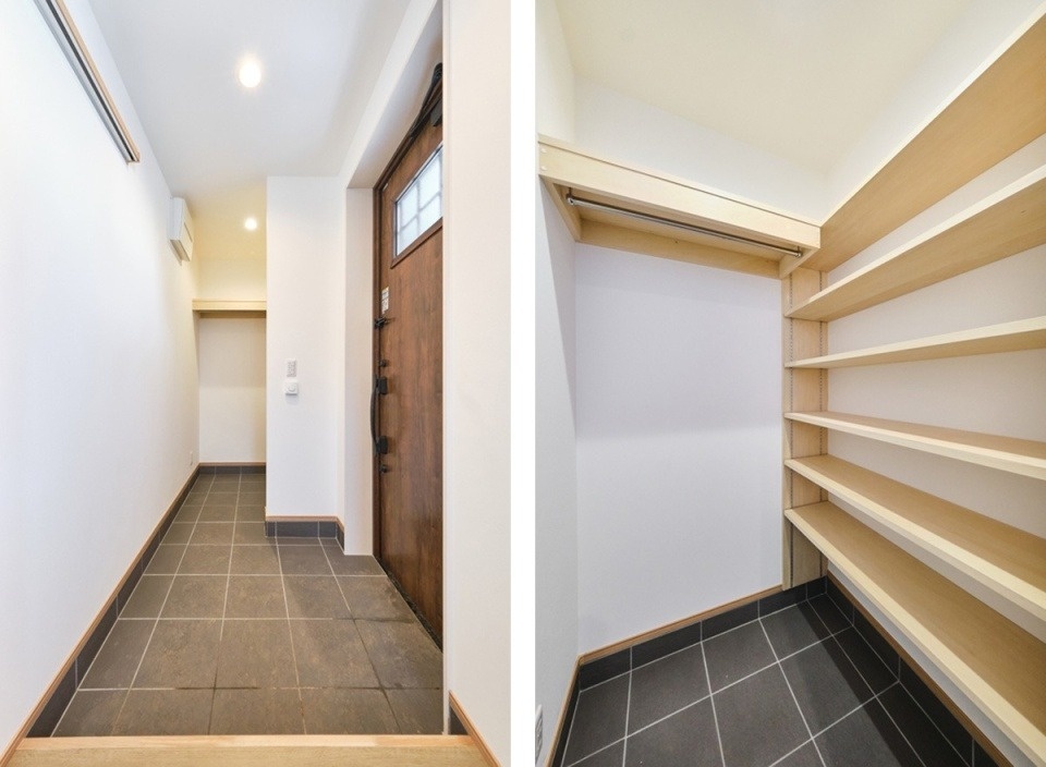 玄関を開けると、右手にはゆったりしたシューズクロークが備えられています(左)。