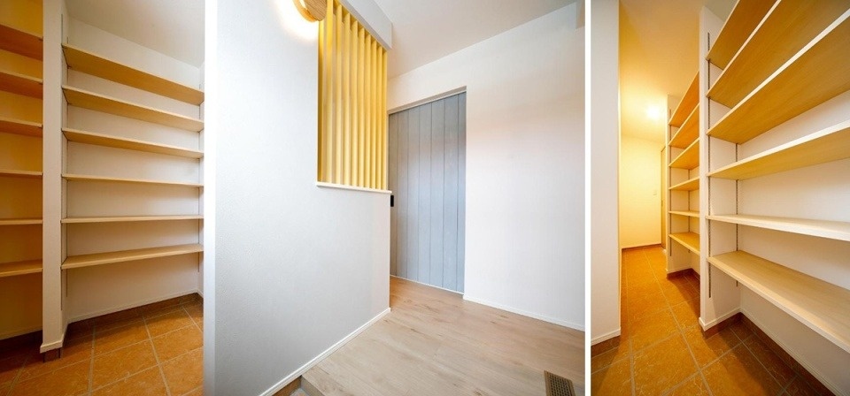 キッチン横にあるパントリーは、階段下を活用。キッチン側の他に、玄関のシューズクローク側にも扉を付けて、出し入れしやすい仕様にしました。買い出し後の収納にも便利です。