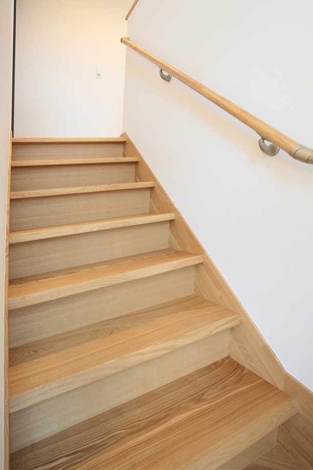 タモの木目の凸凹を強調した浮造り仕上げは、見た目の美しさと足裏に触れる感触の良さが魅力です。樹皮をはいだ木の外側部分にあたるカーブを生かした「耳付き」にすることで、階段に表情が生まれています。