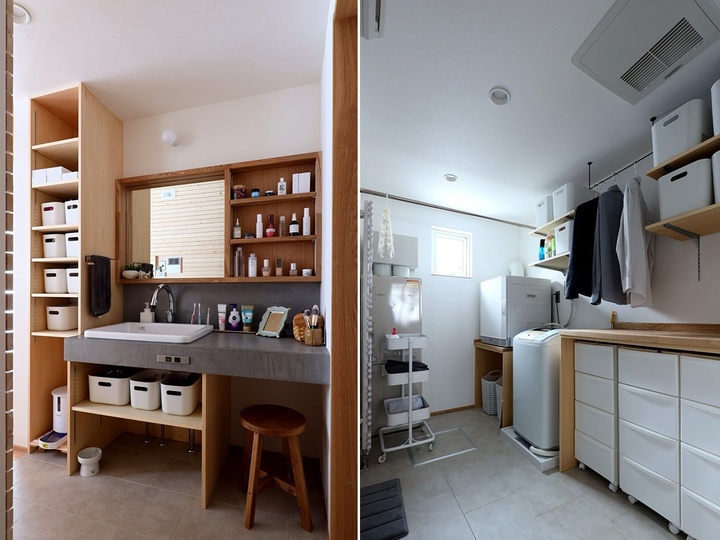 1階で生活に必要なすべてがまかなえるよう、洗面室やユーティリティなどを配置。洗面室の洗面台はモールテックス、壁面収納や棚は大工さんの造作です。奥さまがイメージを膨らませて希望を伝えました。ユーティリティは洗面台の奥にあり、リビングからもキッチンからも行ける回遊式動線になっています。収納ケースやガス式衣類乾燥機「乾太くん」に合わせて、大工さんに棚を造ってもらいました。
