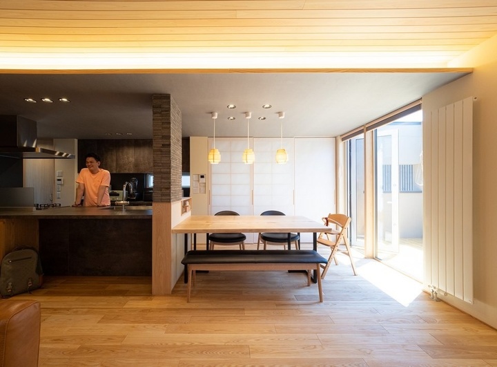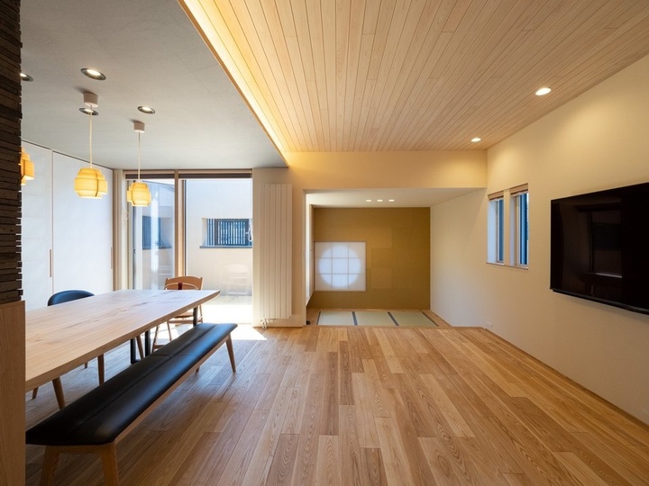 リビングの天井はヒノキを使った羽目板仕上げ。床はタモの無垢材です。ダイニングの天井は間接照明を施し一段低くなっていて、天井の美しい木目が照らし出されています。畳スペースには京寺をイメージした円窓を提案。からし色の和紙を張った壁面によく映えています。窓越しに見える格子も良いアクセントになっています。