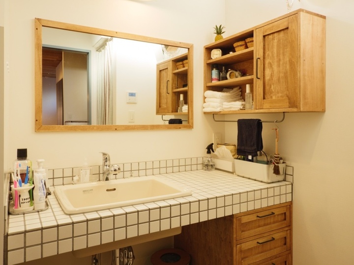 既製の家具がほとんど見当たらないS邸。洗面所の洗面台と鏡、トイレの収納なども全て造作で作ったものです。写真左の鏡の両脇部分は一見壁に見えますが、ティッシュとペーパータオルがそれぞれ下から引き出せるようになっています。