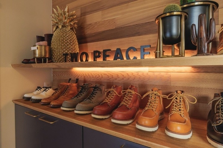 床はニューヨーク州ブルックリンにある高級ホテル、ワイスホテルのエントランスを参考にフローリング材を斜め張りに仕上げました。玄関へと続く扉にはYKKのガラスドアを採用、視線が抜ける造りにしています。壁面の吊り棚は造作で作ったものです。真鍮製の取っ手も施主支給で取り付け、全体がしっくりと馴染むデザインになりました。
