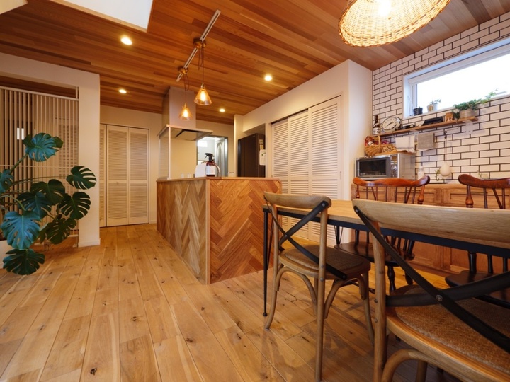 キッチンは既成品に、外周は大工の造作で「フィッシュボーン」を採用し室内の雰囲気に合わせました。