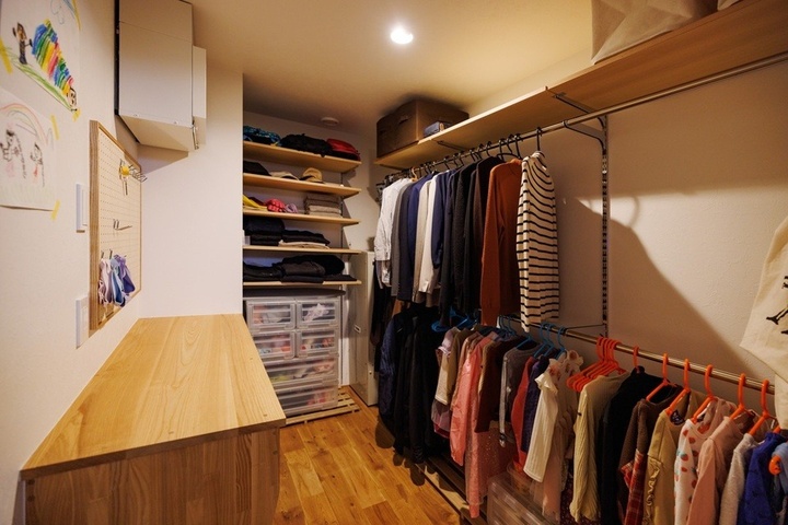 洗濯・脱衣室を出てすぐ左に家族の衣類を収納できるファミリークローゼット。家事室も兼ねアイロン台にもなる作業カウンターや小物収納用に有孔ボードも備えました。