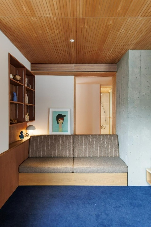 リビングのソファやテレビボードも職人による一点もの。引き戸や枠などの建具も造作です。ウール素材のブルー・カーペットがどこか懐かしく、居心地の良さを感じさせてくれます。