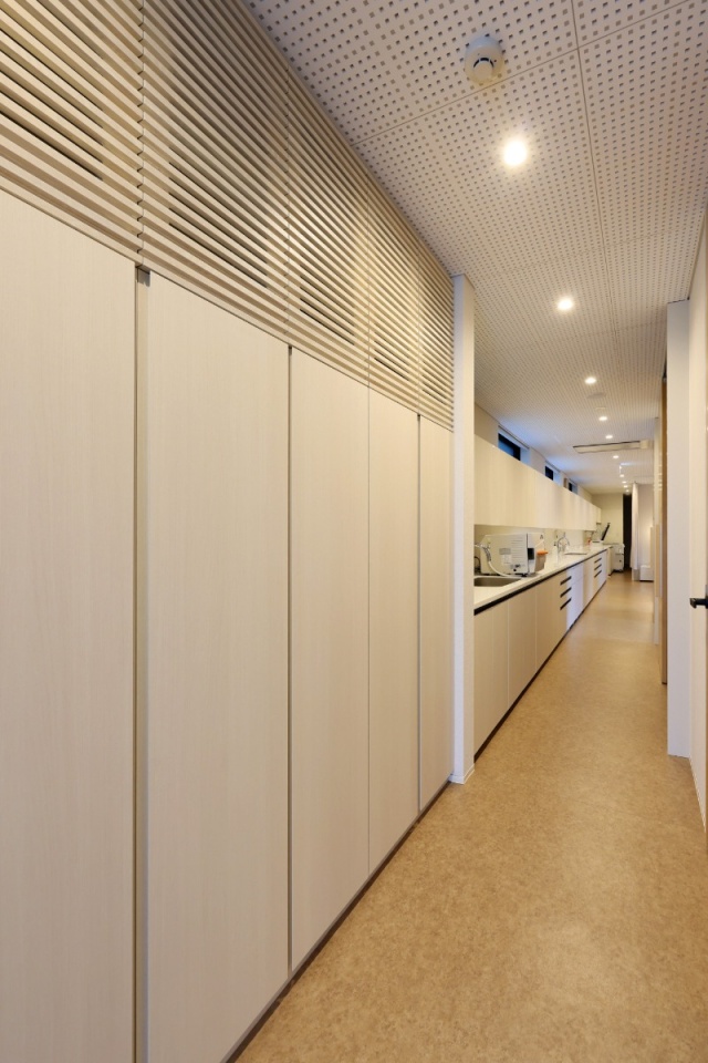 直線でつながるバックヤードは、処置室をはじめ、各室につながる動線が確保されています。扉付きの収納棚も造作によるもの。上部のルーバーは空調の目隠しになっています。