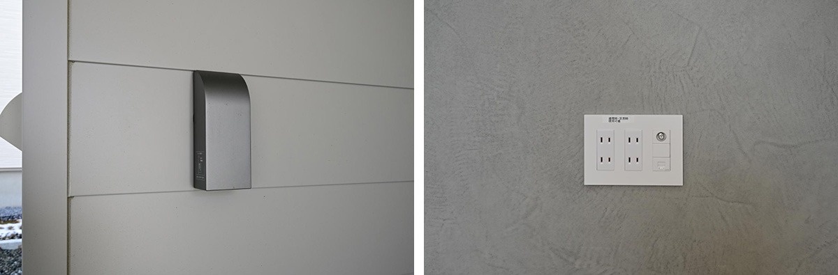 カーポートには、電気自動車やポータブル蓄電池などから電気を供給できる「スマートエルラインライト」を設置しています(写真左)。リビングのテレビスペースには、専用コンセントが(写真右)。災害時には車載のAC コンセントや発電機・蓄電池をケーブルでつなぎ、室内で最大1500Wの電力を使う事ができ、もしもの備えも万全です。