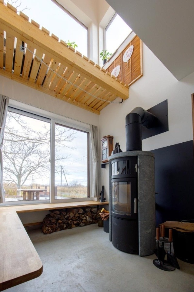 窓辺には薪が積み上げられています。薪山越しに外の景色が見えるように敢えてこの場所に薪置き場を作ったそうです。「晴れた日は2月でも日中は暖房が不要ですし、朝晩も補助暖房のエアコンだけで十分暖かいのですが、やはり部屋の中に火があると落ち着きますね(ご主人)」。