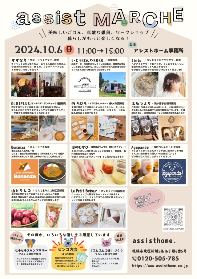 2024年10月上旬、小春日和の日曜日、アシストホーム(札幌市北区新川)のショールームと駐車場は、家族連れの方を始め、大勢の人で賑わいました。本格マルシェが開催されたのです!美味しい食べ物や、作家さんの作った素敵な雑貨、花屋さんや本屋さん、ワークショップなどが楽しめると聞き、編集部の松下もお邪魔してきました!