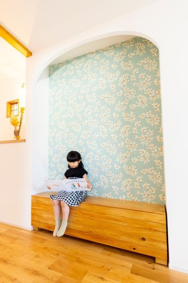 アーチ状の下がり壁とアクセントクロスでひと際映えるヌック風スペース。DIYが好きなご主人がお手製の収納ベンチを作ったので、ゆったりくつろげる場所になりました。